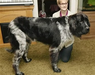 Este Landseer Newfounland, de tres años de edad, pesa 82 kilos. Los nueve kilos de comida que le compran apenas le duran dos semanas. Boomer ya es la atracción de la localidad. Es tan grande que bebe directamente del grifo de la cocina de la familia sin necesidad de alzarse sobre sus dos patas delanteras.¡¡ Lo hace en posición normal!.