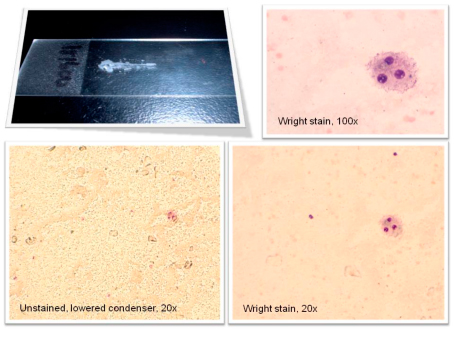Un pastor alemán de 2 años de edad, es presentado para la evaluación de un nódulo subcutáneo ubicado a la altura del olécranon (codo). El nódulo es muy duro al tacto. El material obtenido a través de aspiración con aguja fina es arenoso y de color blanco tiza. Sin tinción, visto al microscopio con un nivel bajo del condensador, el material se muestra refractante. Después de la tinción con Wright\’s-Giemsa no se aprecian muchas cosas excepto por un fondo punteado, un número reducido de glóbulos rojos y, ocasionalmente, macrófagos de los cuales algunos son multinucleados.
